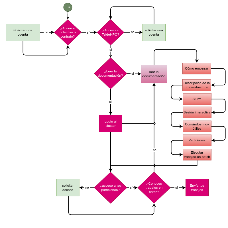 Esta página lo guiará brevemente a la documentación. Si sigue los pasos a continuación, debería tener una buena idea sobre los aspectos más importantes del clúster TeideHPC.